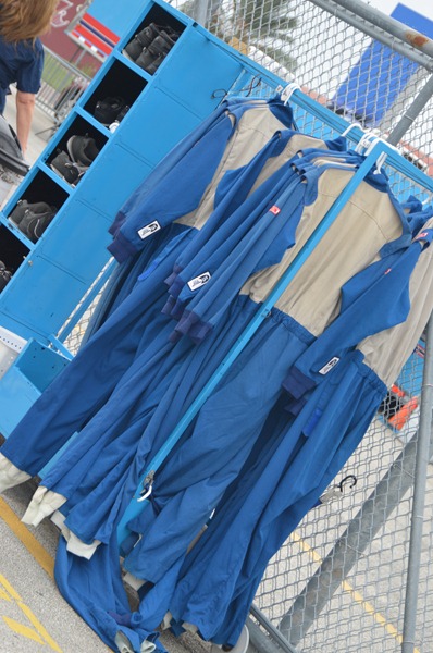 We made it to the track to check in and were instructed to drive under the track onto the infield. There, we met up with the rest of the group at the Driving School classroom. The guys (and a few women) got fitted for their helmets, their jumpsuits and were then given the basics…